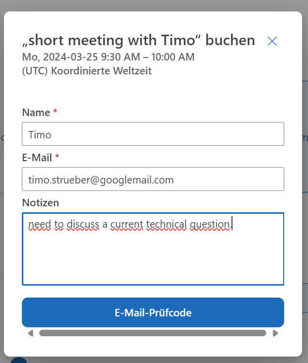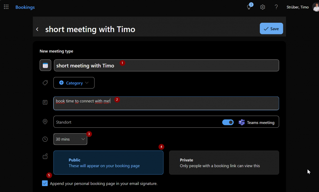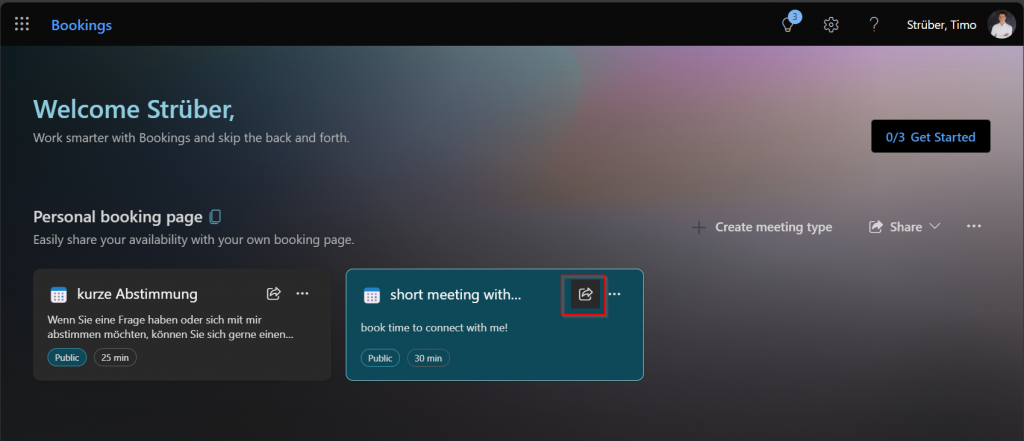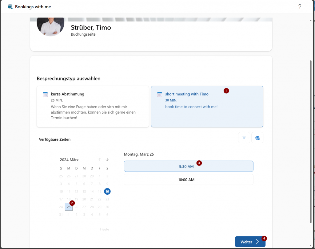 Recently, I have been thinking a lot about how to improve scheduling with my clients. Using Scheduling Poll improved the burden of multiple interruptions of my work because of back and forth emails to find an appointment. I had heard about Microsoft Bookings, but when I looked at the tool, it was a bit overkill for my frequent appointments with my clients, with whom I am in regular contact. Just recently I found the tool Bookings with me and I would like to share this with you. With this tool you create a booking page where external users with access to the page can search for a free time slot in your calendar and schedule a meeting with you directly. After successful scheduling, an invitation with a link to a Teams meeting is sent to the attendee and the organizer receives a short notification.