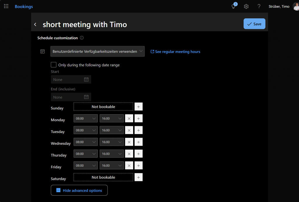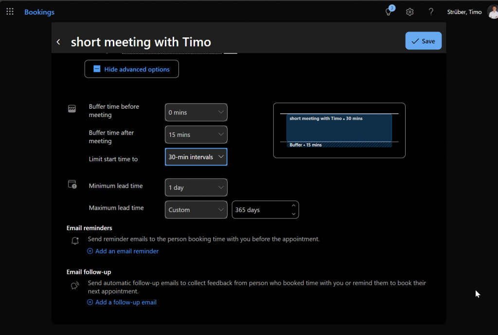 You can specify buffer time before and after the meeting or limit the start time for scheduled appointments to 30-minute intervals or full hours. With a lead time of one day, you have enough time to prepare for a created appointment. Click ‘Save’ in the top right corner when you’re done: