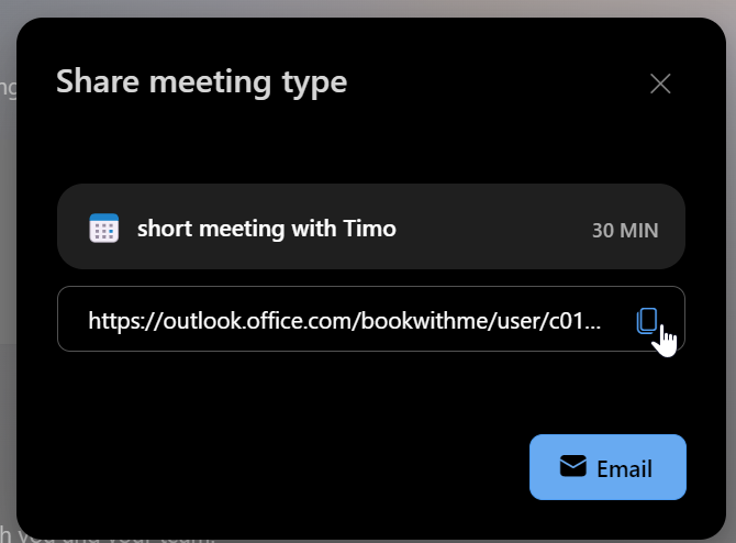 This brings you back to your Bookings with me page. From here, you can choose to share a link to your specific meeting type or your entire Bookings with me page. Here, I am sharing the link to my newly created meeting type: