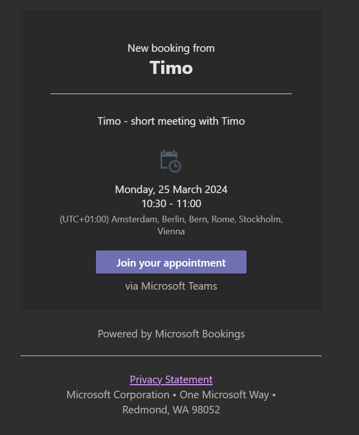 The owner of the Bookings with me page receives an email verification for the successful booking. (Apologies for booking an appointment with the same name as the page owner.)
