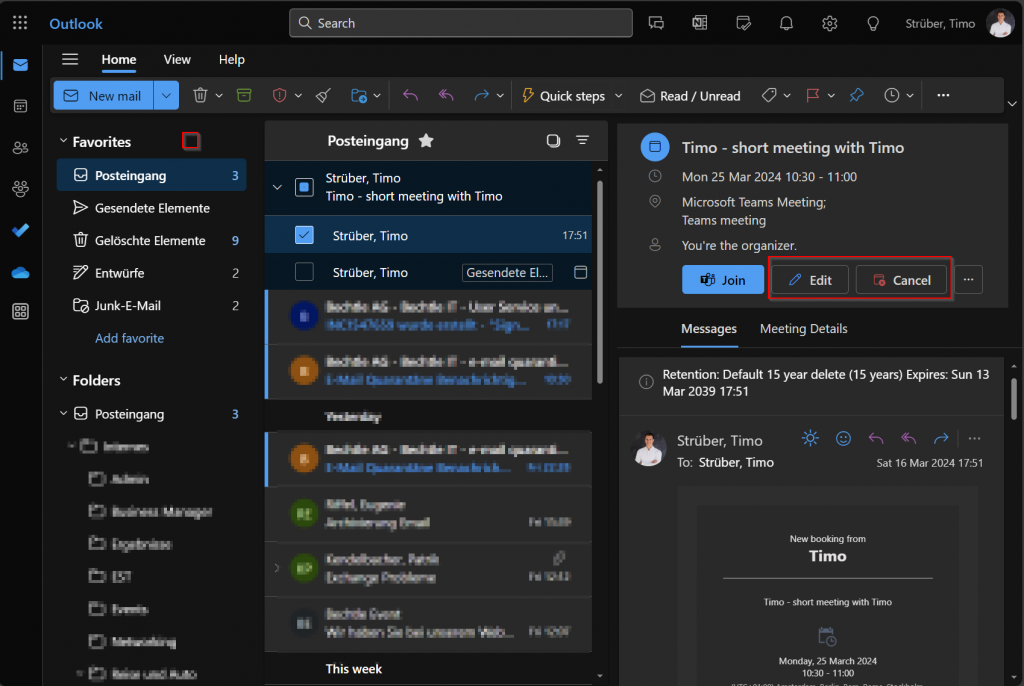 The appointment is scheduled in the calendar, and an invitation is sent out to the attendee with a link to a Teams meeting. As the organizer, you can directly cancel the meeting from your inbox or edit it: