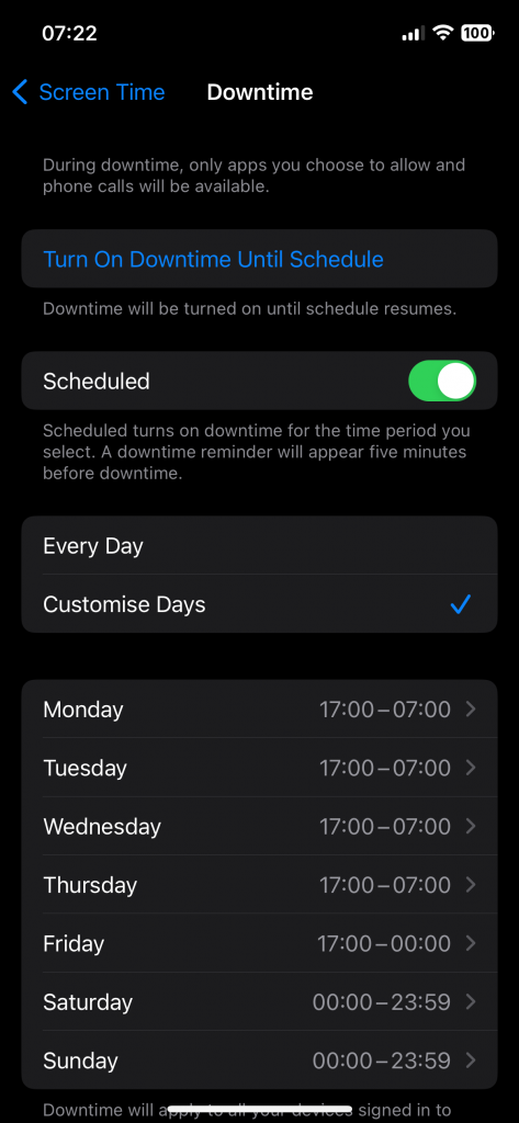 Next, configure your downtime times. You can set a different schedule for each day, as shown in the screenshot to the right. This is just an example.
