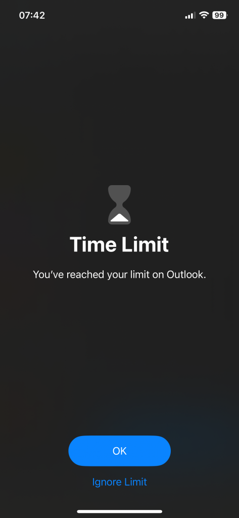 When you open an app that is currently limited, you receive a message informing you that you have reached your time limit on the app. You can either accept this message or ignore the limit and open the app anyway.