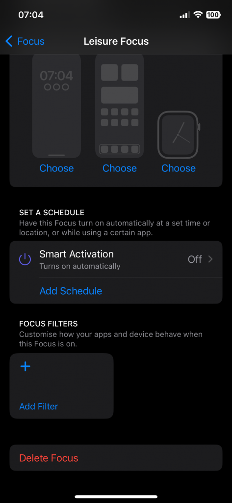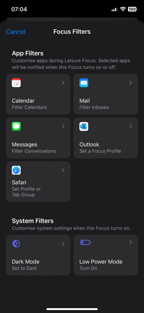 With focus filters, you can filter the different calendars added in your calendar app. This way you can select to only receive notifications from your personal calendar when you are in ‘leisure’ focus mode. The same filter mechanism is possible for your mail app.
