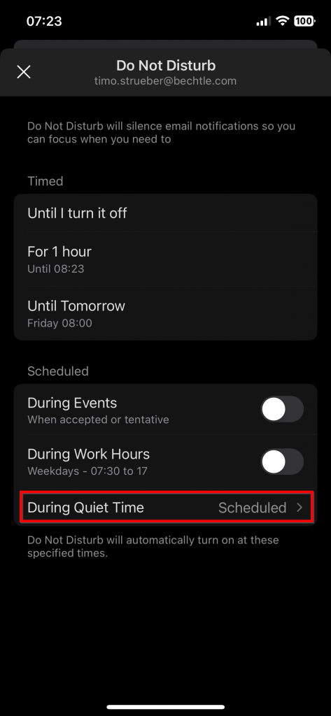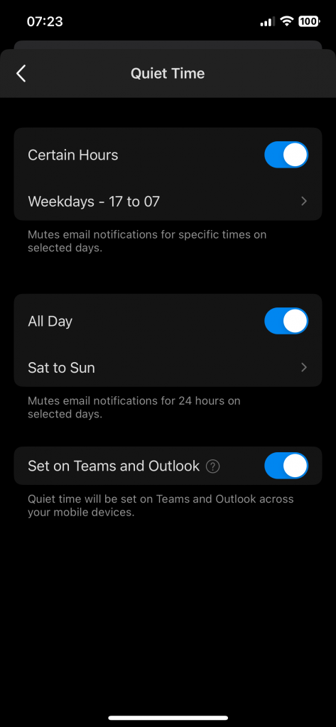 A useful feature is that you can sync your quiet time automatically to Microsoft Teams.