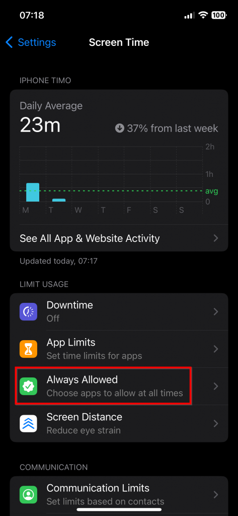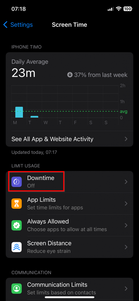 The next feature, called ‘Downtime,’ is located under the Screen Time Setting. It disables all apps except for those you configure as always allowed. This feature allows you to take a break from notifications and reduce the risk of opening blocked apps during scheduled downtime as well.