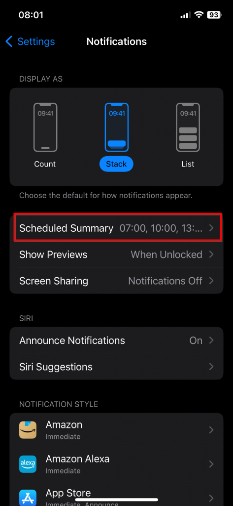 iOS has a useful feature called scheduled summary. It allows you to select apps from which you don’t want to receive instant notifications. Instead, notifications from these apps are captured and displayed in a single summary notification at a specific time. This feature reduces interruptions and gives you control over notification times.