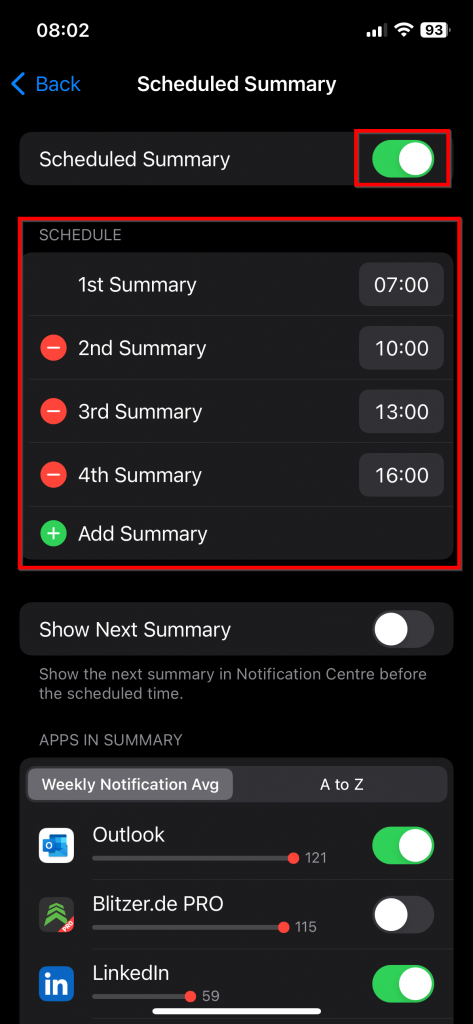 1. You have to enable the feature at the top 2. Define a schedule for your summary. Determine the times at which you want to receive scheduled notifications. I have configured four times to get the summary.  To create a scheduled summary, select the apps you want to include. You get insights about their average weekly notification count. Once you choose an app to be part of the summary, you will no longer receive direct notifications from it. Instead, notifications will be shown in the summary at the designated times.