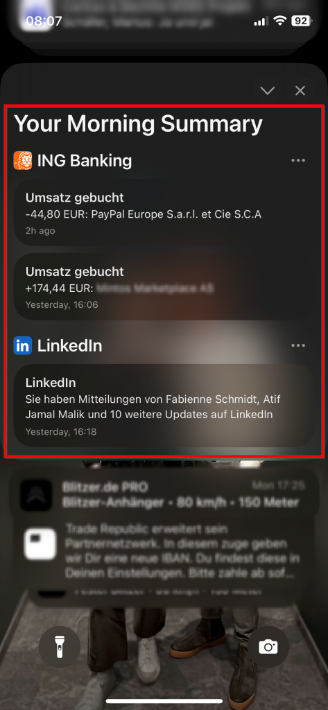 When it’s time for a scheduled summary, you will receive a notification containing a summary that you can expand to view the included notifications. In the example on the right I received a summary containing notifications from my banking app and LinkedIn.