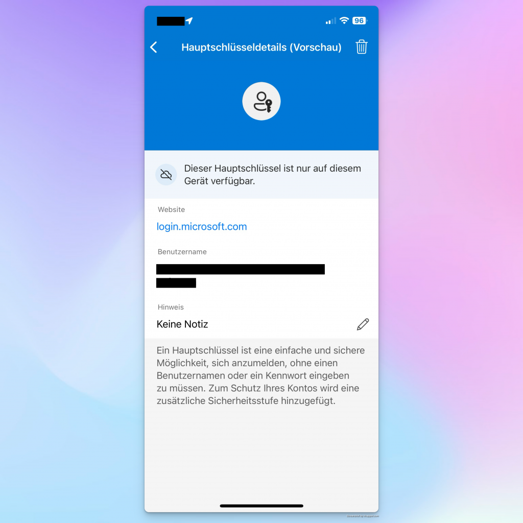 After checking the account in the Microsoft Authenticator app, I can see that the passkey (hash key) is activated: