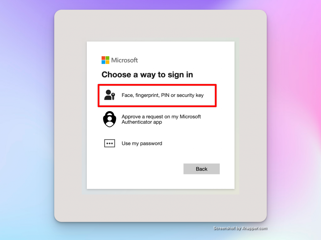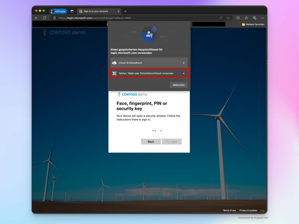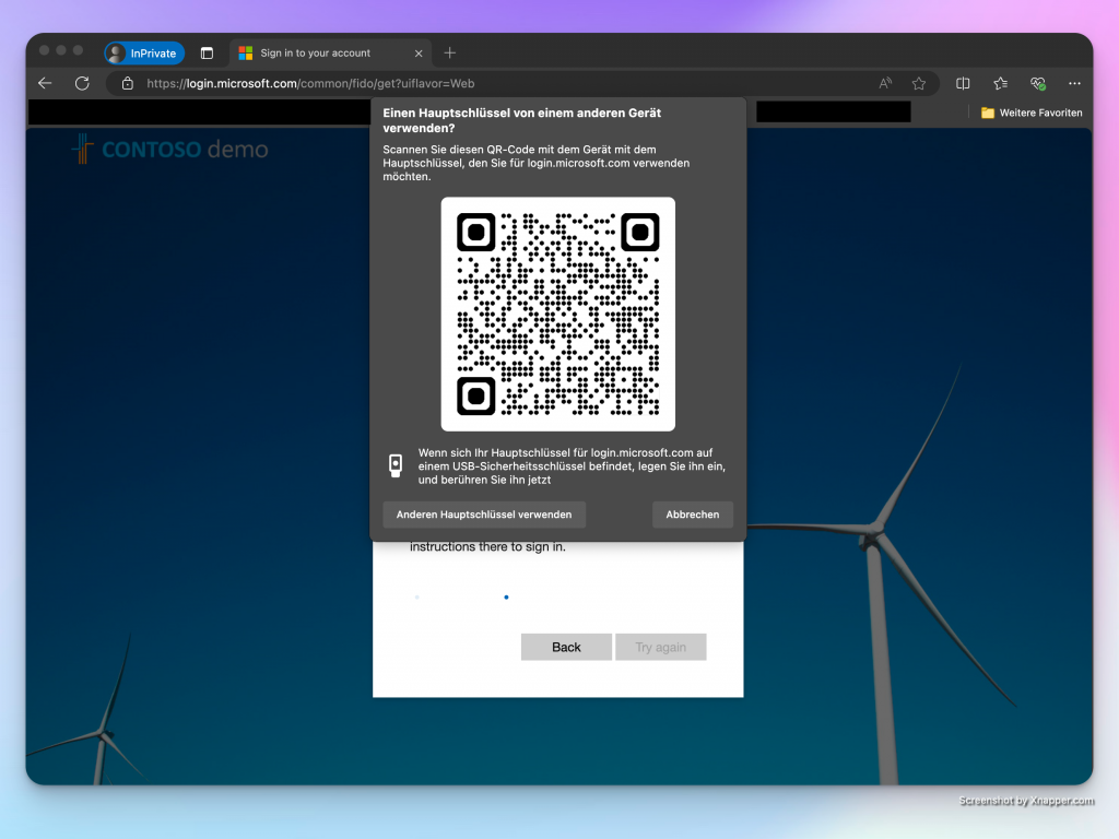 I can choose between my recently configured Passkey or the Authenticator app. I go with “security key,” which is basically Passkey: