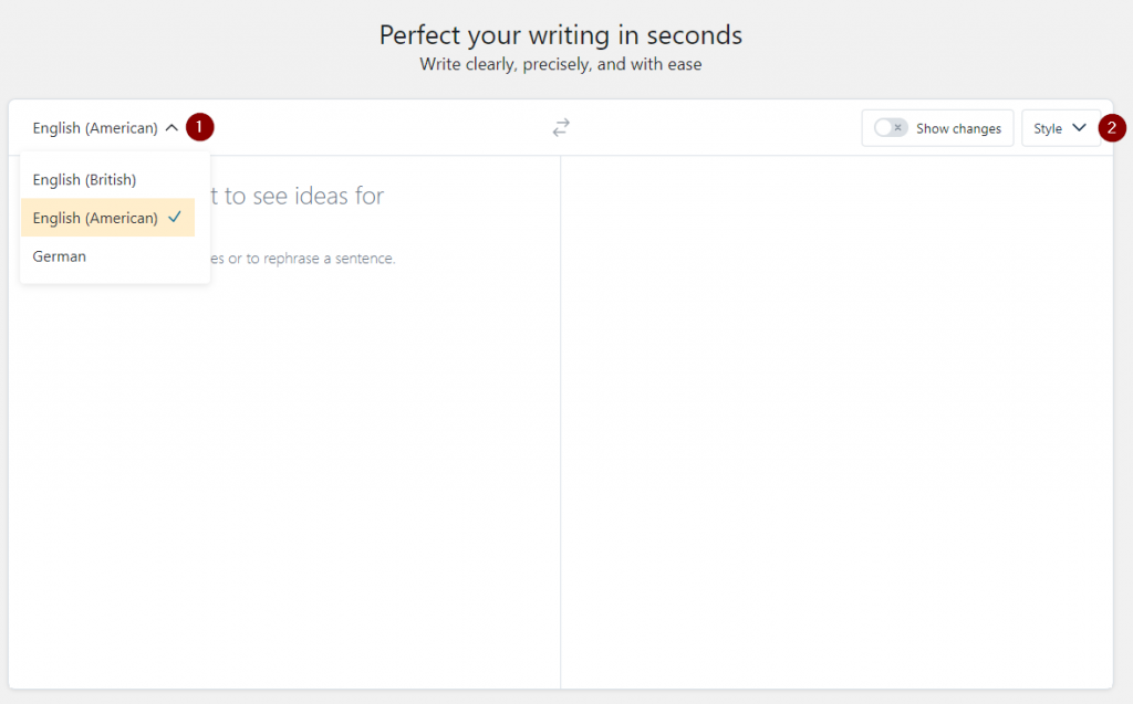 First, select the language in which you wish to write. Currently, only English and German are supported. Second, choose your desired writing style.