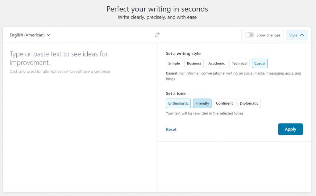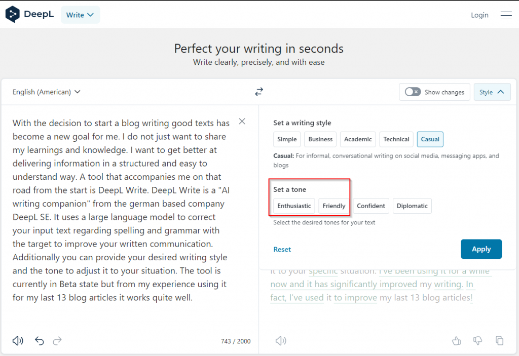 I often use the ‘casual’ style for my blog or the ‘technical’ style for technical how-to guides. In the past, I never set the tone, but now I choose to use an ‘enthusiastic’ and ‘friendly’ tone. You can choose only one style but multiple tones. You must accept your choice with ‘Apply’.