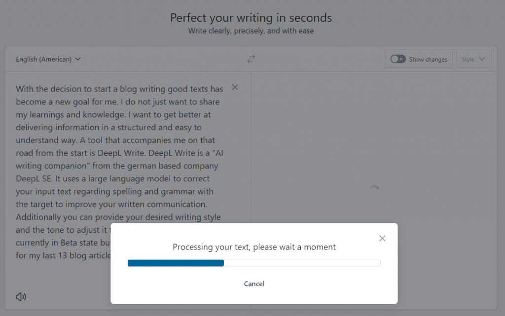 As an example, I will demonstrate how I optimized the introduction of this blog article. After pasting the text, DeepL Write takes a few seconds to process it. In this case, it took three seconds. The processing speed may vary, but in my experience, it is always between one and ten seconds: