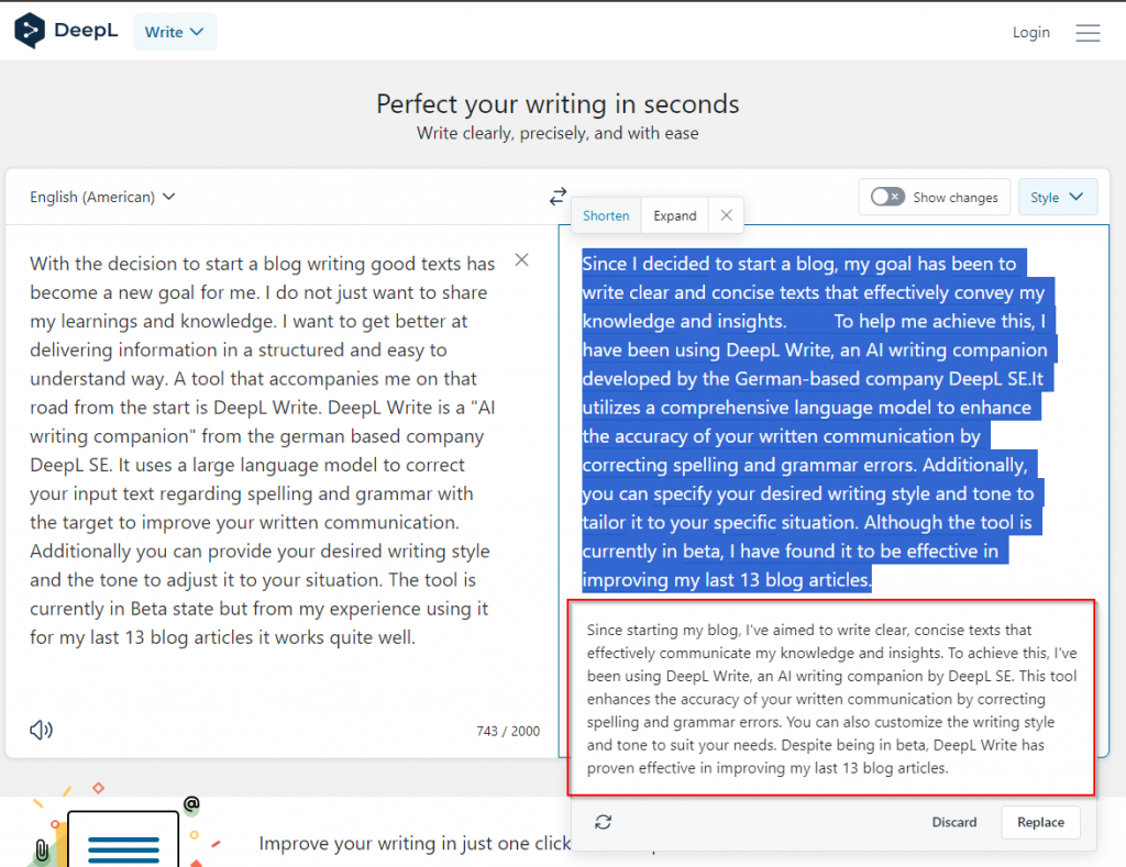 Since I decided to start a blog, my goal has been to write clear and concise texts that effectively convey my knowledge and insights. To help me achieve this, I have been using DeepL Write, an AI writing companion developed by the German-based company DeepL SE. It utilizes a comprehensive language model to enhance the accuracy of your written communication by correcting spelling and grammar errors. Additionally, you can specify your desired writing style and tone to tailor it to your specific situation. Although the tool is currently in beta, I have found it to be effective in improving my last 13 blog articles.