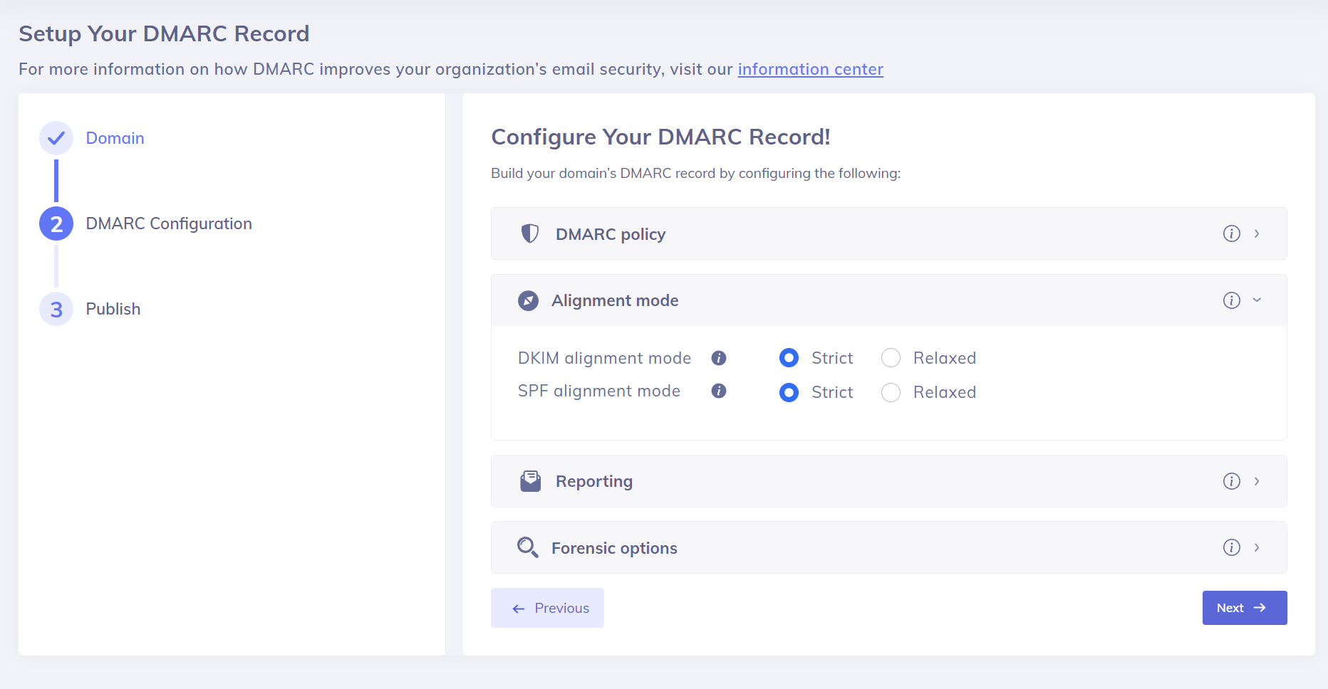 Because I have SPF and DKIM in place and working I go with “Strict” alignment: