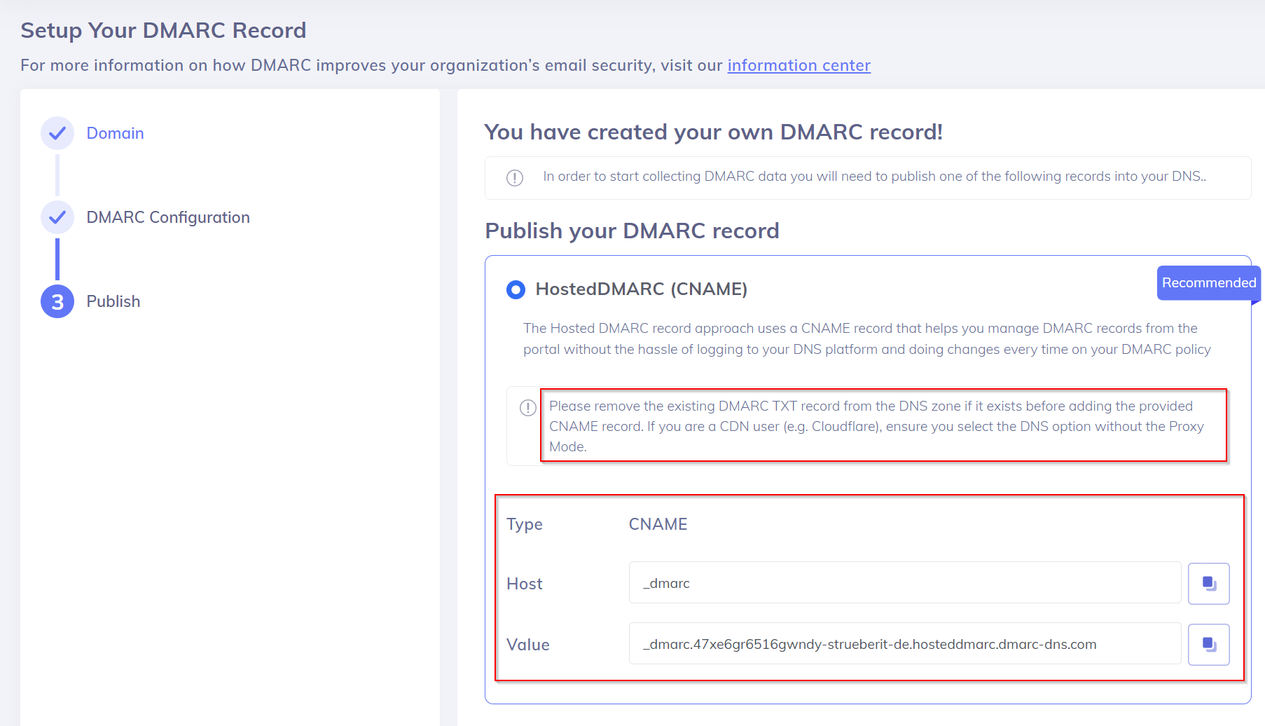 When publishing the DMARC CNAME record I get a hint that I shall remove the old record. This is right for me because I was using Valimail before.