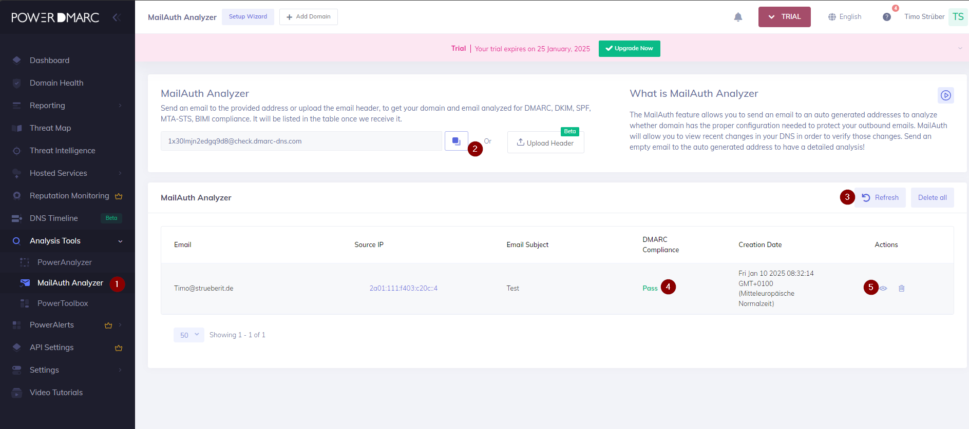 With the MailAuth Analyzer you can check if a sent email is correctly delivered. Just copy the target address (2) and send a test email from your mailbox. Afterwards click on “refresh” (3) to check the email DMARC Compliance status (4). For more details click on “View” (5):