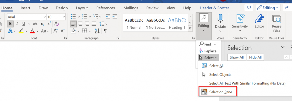 For using the function mentioned in the above article “WordShapeNameToRemove” you must first find the name of the shape used for inserting the label. You must enable the “selection pane” within the editing section in the “Home” pane of Word: