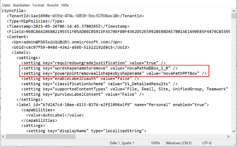 After starting Word your client will pull the new configuration from the cloud and create a new configuration file. Look for the following lines that will show the policy changes performed with PowerShell: