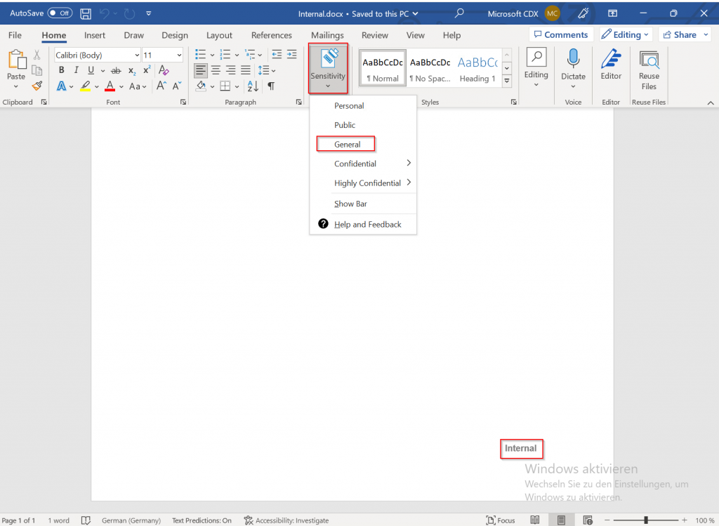 Now I want to test the removal of the old label. I open a Word document with the “Internal” label set and assigning the new sensitivity label “General” with the AIP unified labeling client: