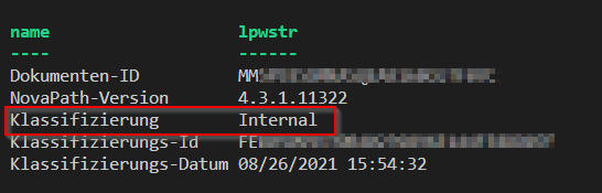 The output shows information like the document-ID, the classification client version and the classification level: