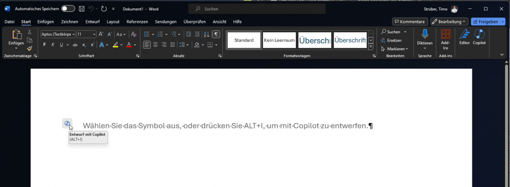 The draft feature is accessible in both Word online and the standard App for Windows or Mac. If your license has just been activated, it is recommended that you use the Web version as activation in the standard App may take some time. To access the feature, click on an empty line in the document or press ‘ALT + I’: