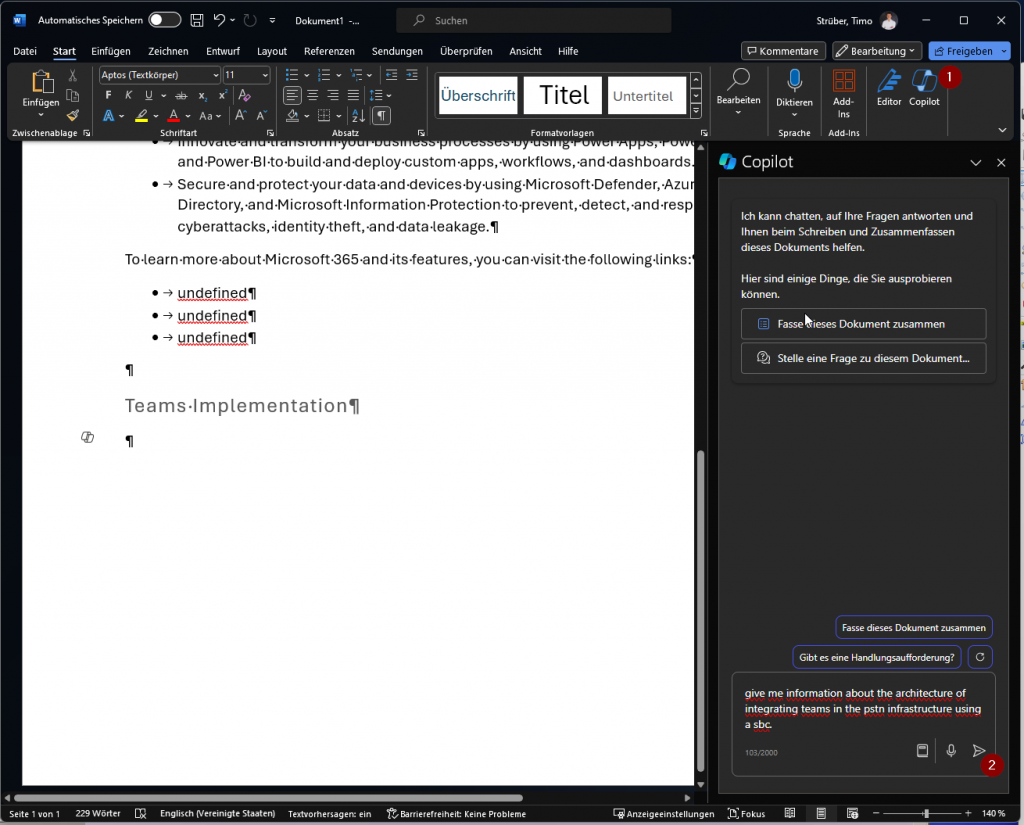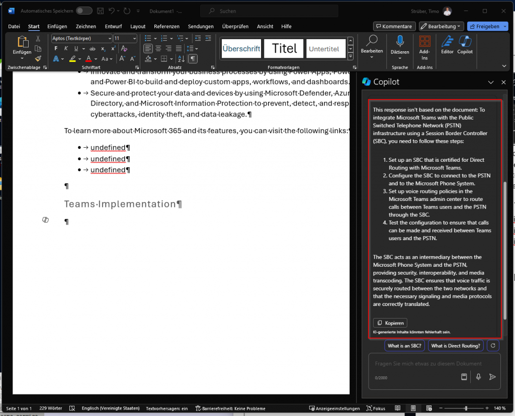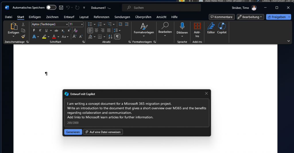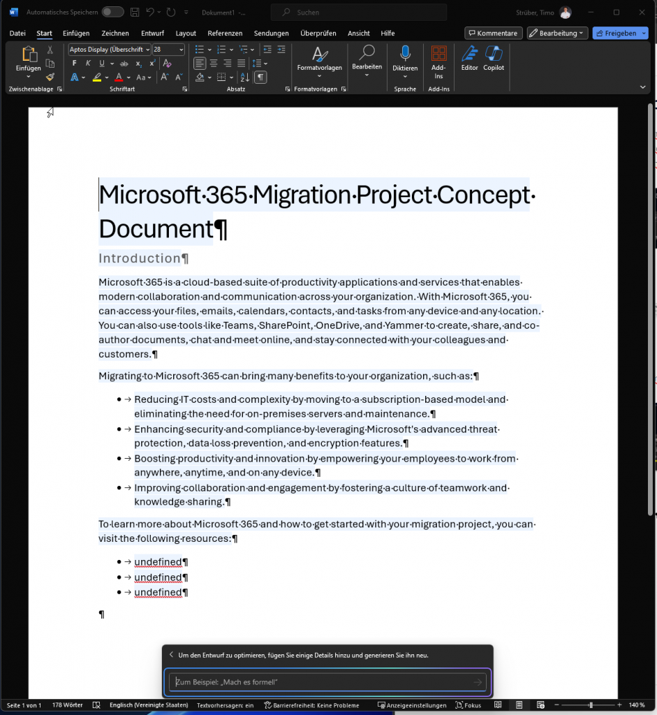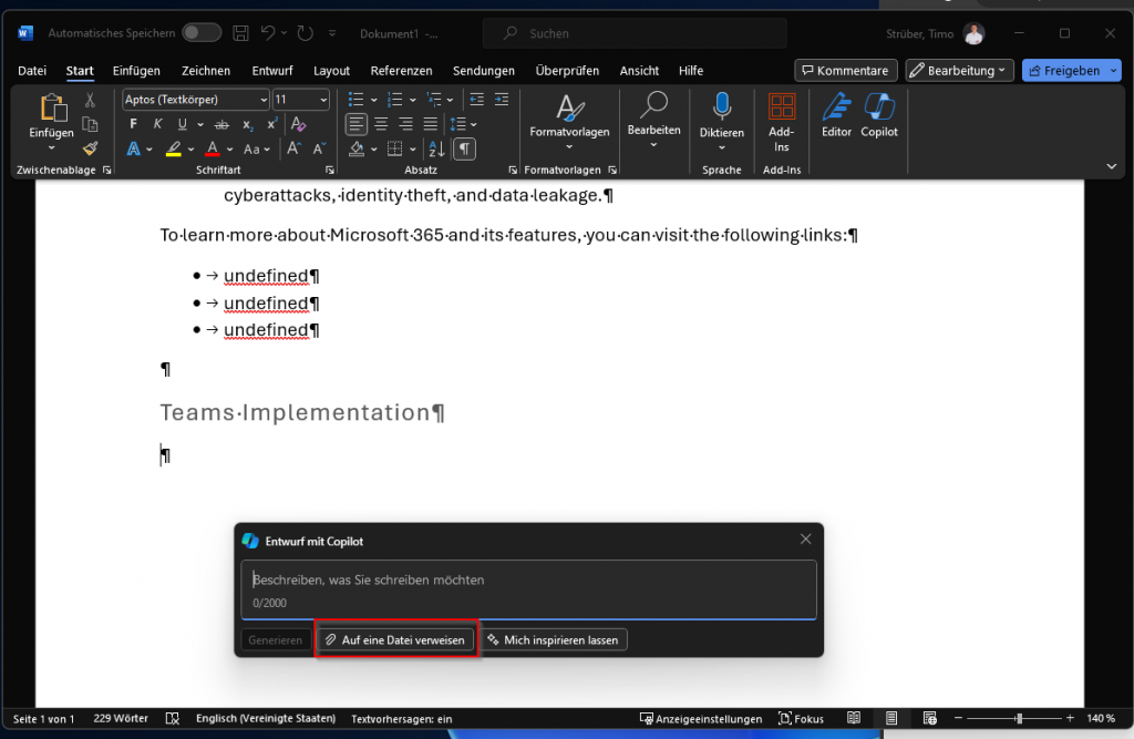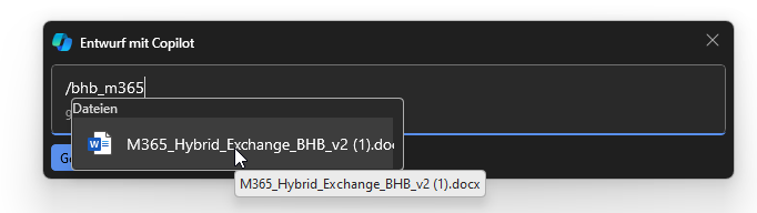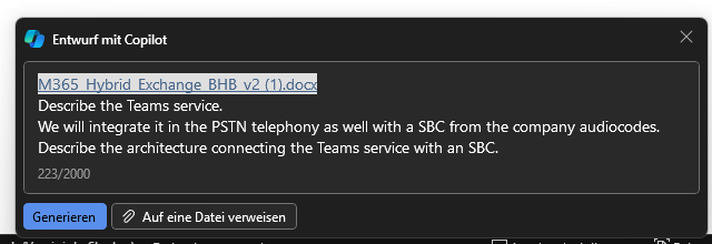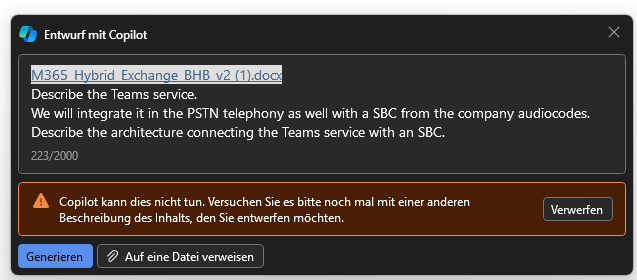 The drafting feature worked well for my specific use case of creating a technical concept document for a Microsoft 365 migration project. It provided concise summaries of the technologies I needed to describe. However, the tool’s efficiency will depend heavily on the specific use case. During my test, I discovered some limitations of the new feature. For example, the file reference function is currently not functioning.